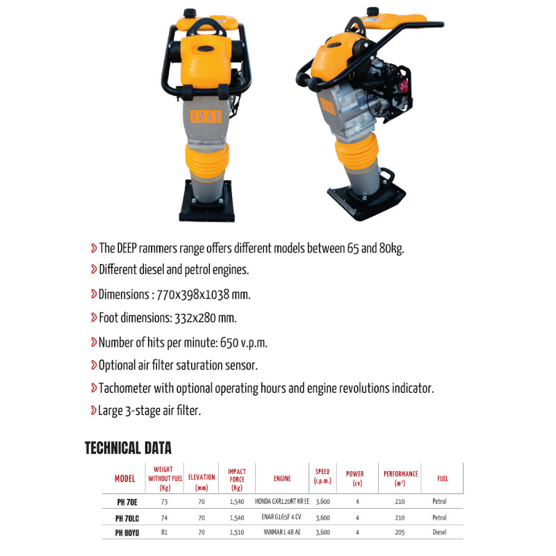 - Technical Specifications: Models like PH 70E, PH 70LC, PH 80YD, with various impact forces and power ratings.